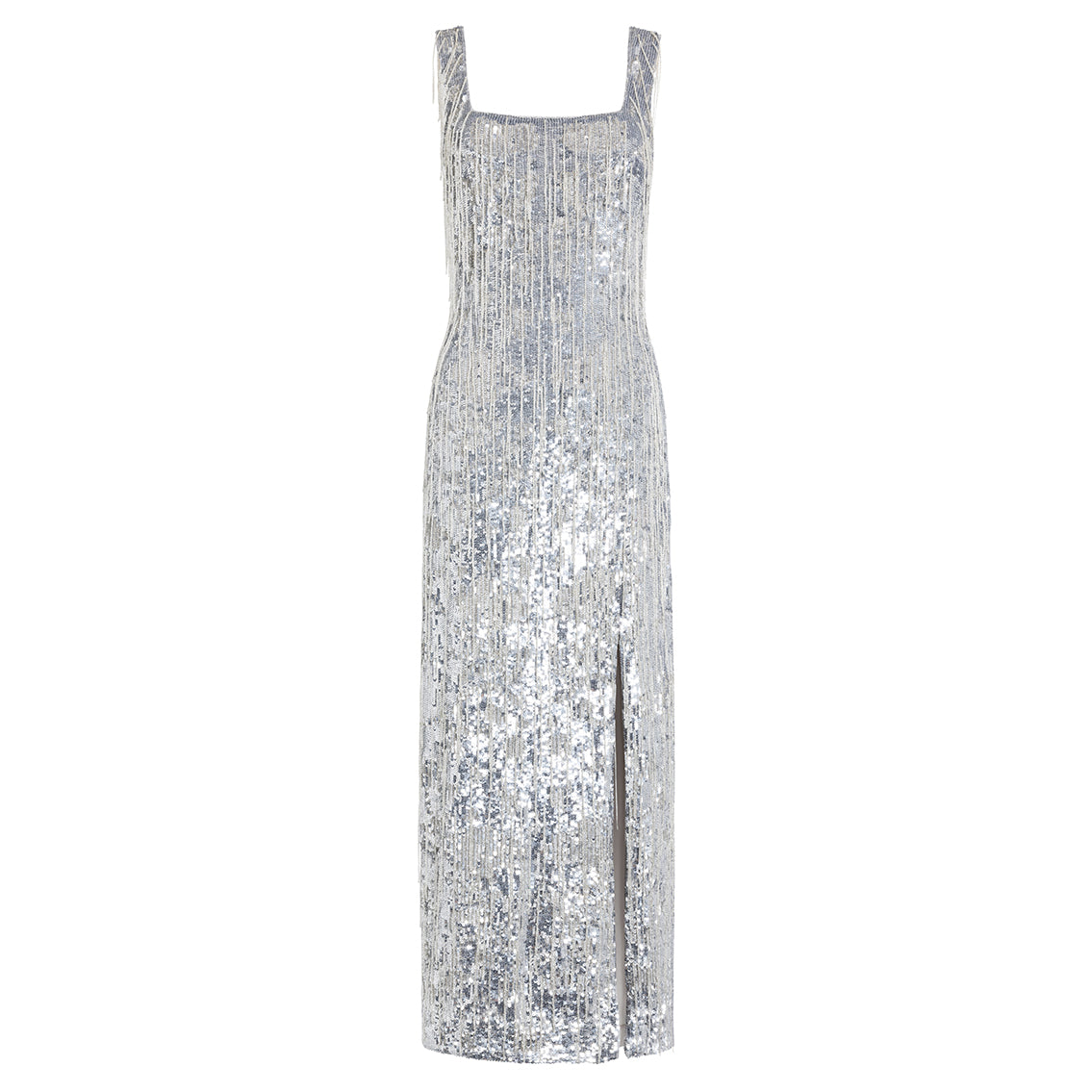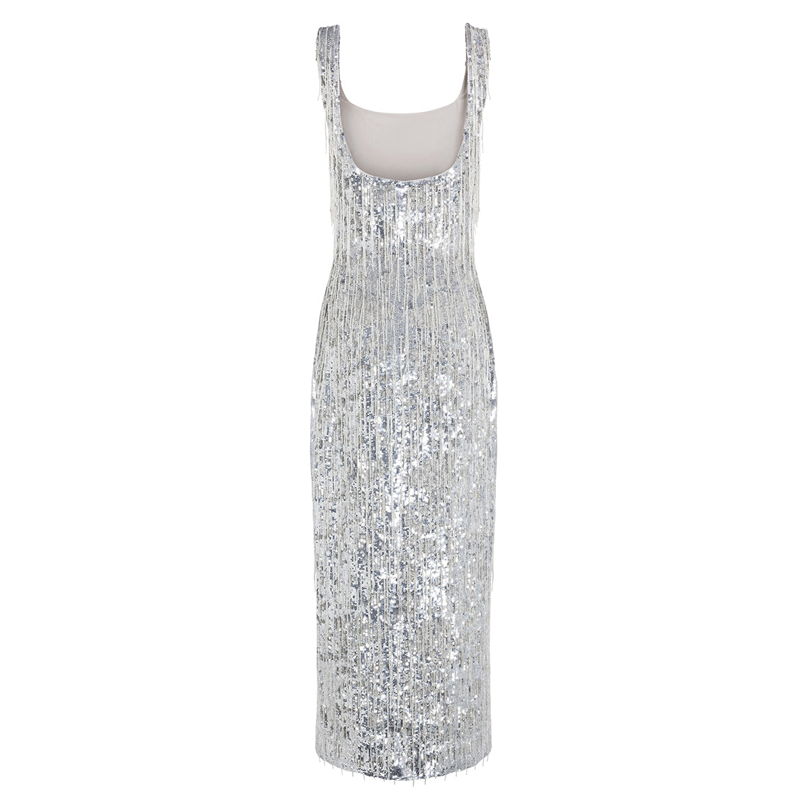 This elegant silhouette is dripping in silver sequins and fringing made of delicate glass beads that glisten with every step. All of the embellishment is hand beaded by artisans, creating a dress that will be treasured for a lifetime. The Avriel dress is a standout piece this season with its refined square neck and internal corsetry that accentuates your waistline for a flattering fit.