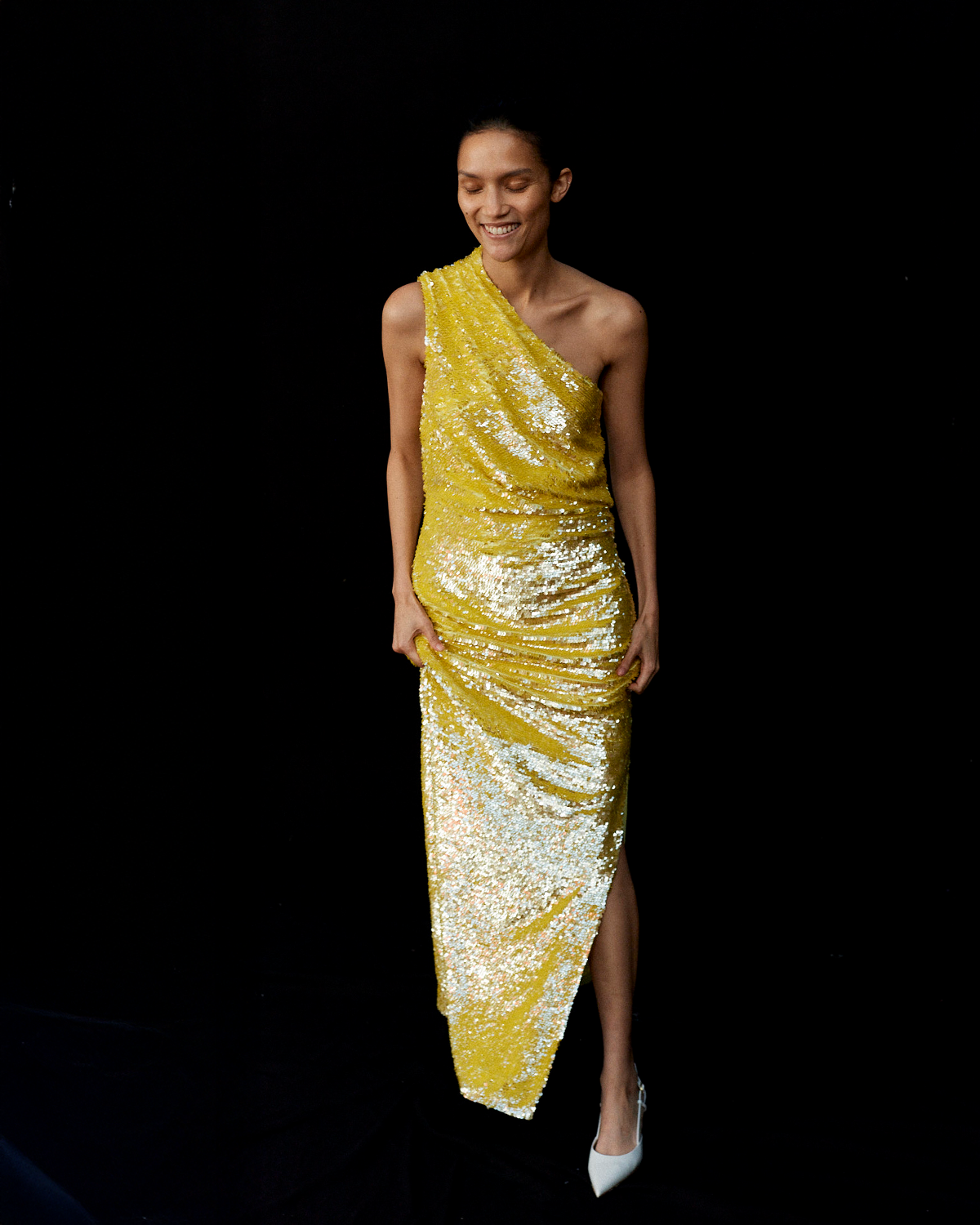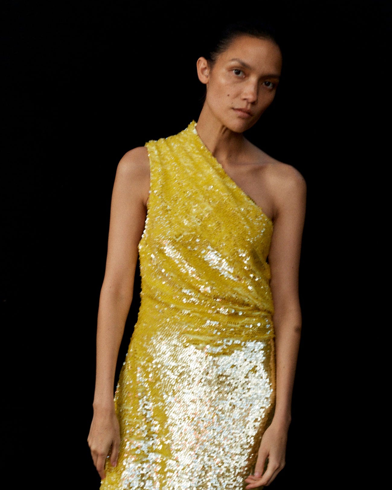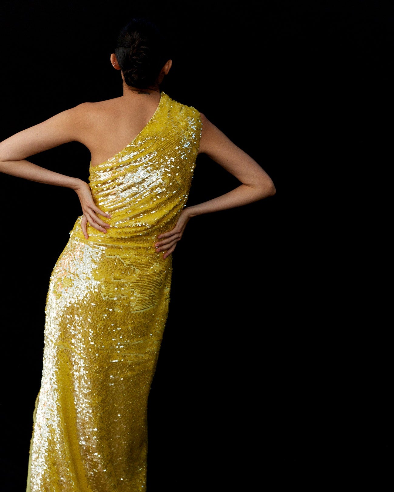 The Kyra dress in vibrant yellow features an asymmetrical one-shoulder design, fully adorned with shimmering sequins. Kyra has a sleek, body-hugging fit, a timeless piece for all occasions.