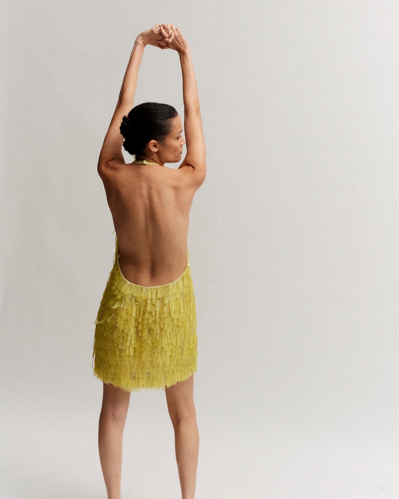 Fleur is hand embellished with countless yellow beads and sequins that sparkle in the light. Drenched in tiny star sequins, clusters of dangling teardrop shape paillettes, and strings of tiny silver beads, it shimmers as you move. This mini backless halter dress promises to sparkle under the disco lights.